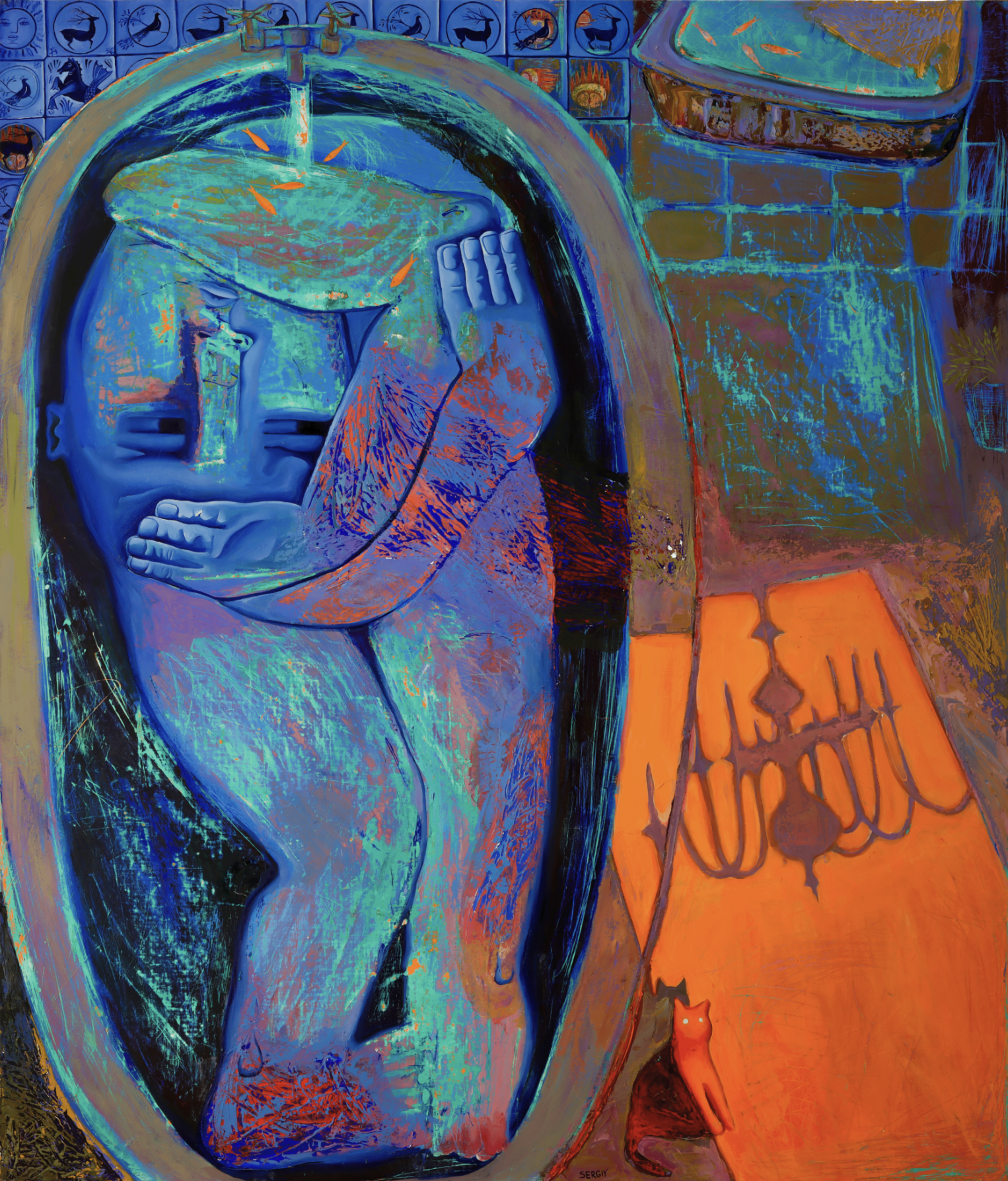 Water trickles from the faucet, while small fish hover above, suggesting fragile thoughts or fleeting memories. The surrounding tiles and vivid orange floor intensify the tension between cold introspection and burning inner unrest. A small red cat watches silently, acting as witness to the scene’s quiet vulnerability.
