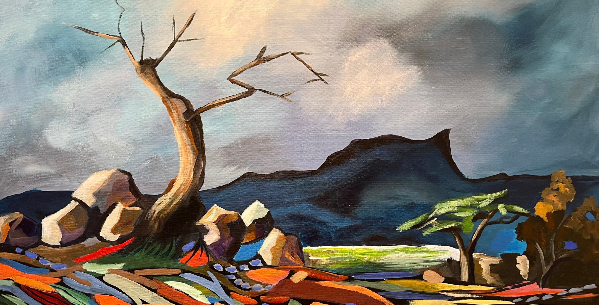 Farrands approaches landscape as lived experience rather than topographical description. Rooted in places she has walked, her paintings register shifting weather, fractured terrain, and expansive sky through a structured yet expressive use of colour. Hills, shoreline, and trees are constructed in rhythmic planes that move between observation and abstraction. Light is not depicted as effect, but as force — shaping form, atmosphere, and spatial tension. Influenced by Expressionist traditions and post-war British painting, Farrands develops a language grounded in structure while remaining attentive to sensation. The works hold a quiet intensity, where landscape becomes memory, movement, and enduring presence.